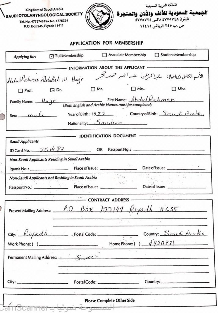 Application form for the society membership