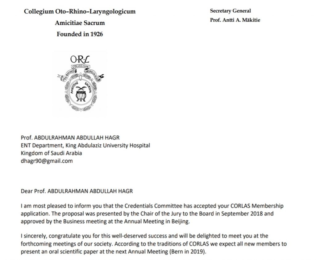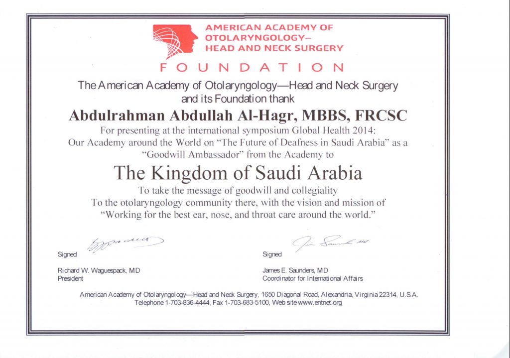 Collegium American academy of otorhinolaryngology head and neck surgery Saudi Otorhinolaryngology Society The Arab Academy of Otology and Cochlear Implant Hearring