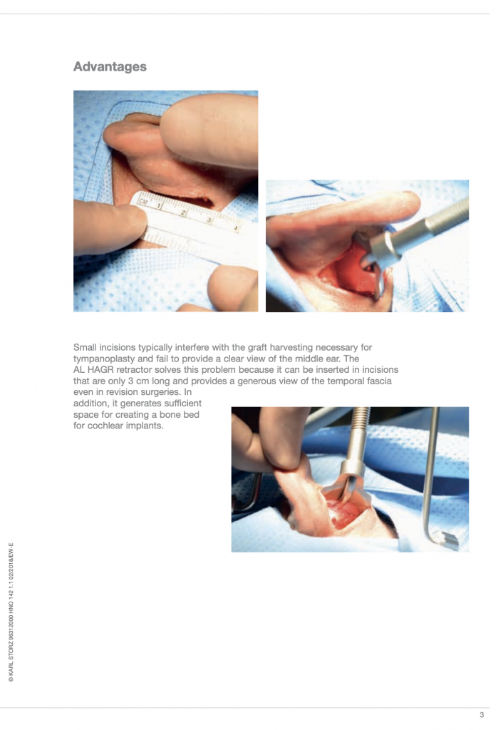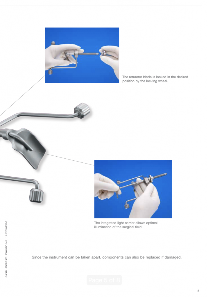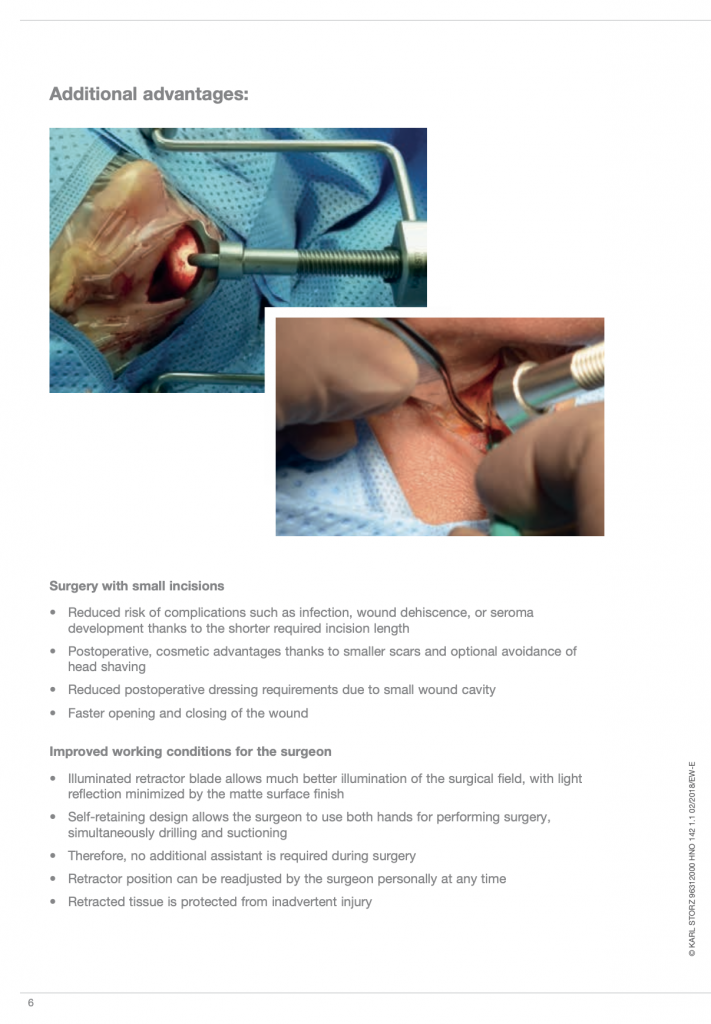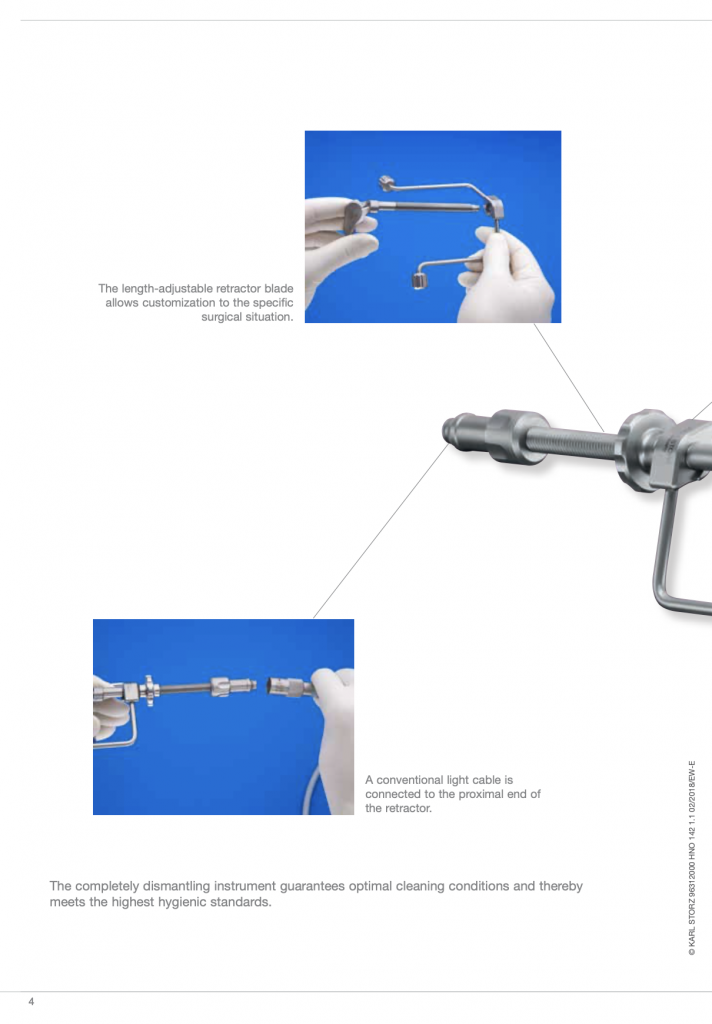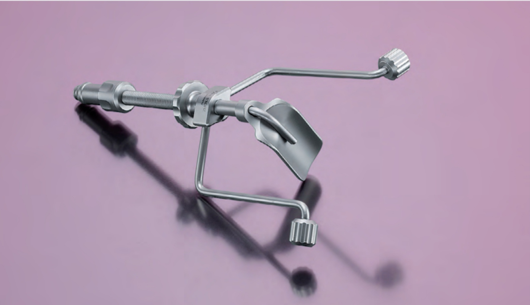 Integrated light carrier for optimal illumination of the operative fieldSelf-retaining constructionNo further retractors requiredAllows surgeon to work with both hands (parallel drilling and suctioning) when preparing the implant siteMatt surface finish prevents irritating glareCan be completely dismantled for optimal cleaning and allows individual replacement of modules in case of damage